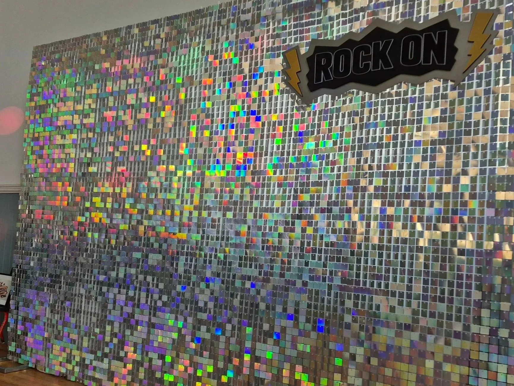 2.1m x 3.0 metres (7ft x 9ft) of shimmer to add to your special event - the perfect backdrop for photos. Hire includes our custom made diffuser fan which keeps your wall shimmering perfectly all night long!